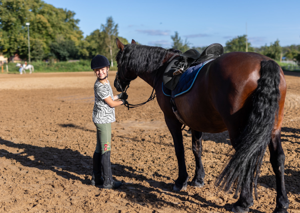Horse riding school. Little children girls at group training equestrian lessons at outdoors ranch horse riding hall. Cute little beginner blond girl kid near beautiful brown horse.
